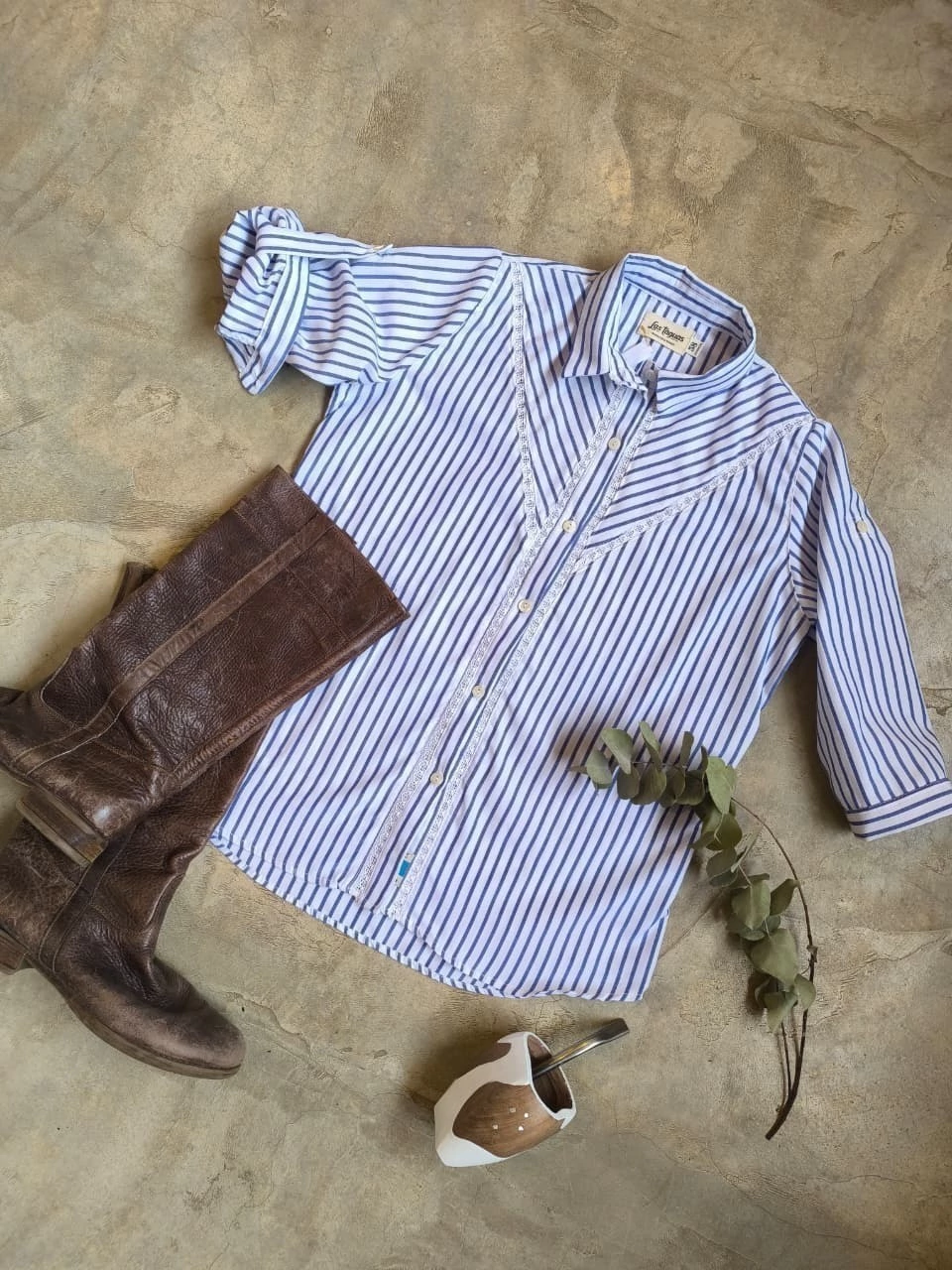 Camisa m/l clásica con charreteras, recorte y entredós
