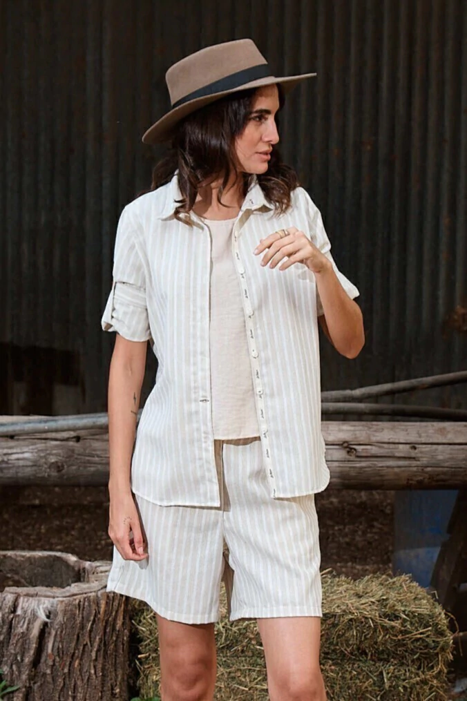 CONJUNTO Camisa 3/4 c/charreteras + Bermuda pinzada lino rayado