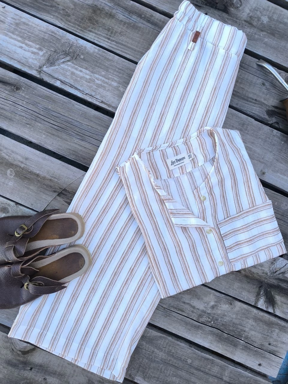Pantalón ancho largo a media pierna y cintura en elástico en lino rayado