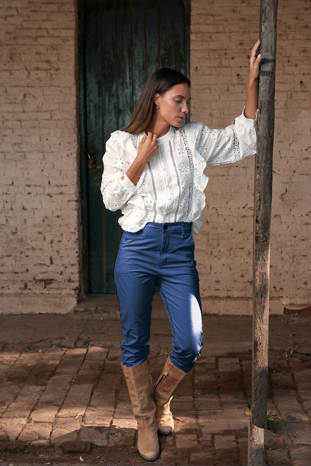 Pantalón ancho largo a media pierna y cintura en elástico en lino rayado